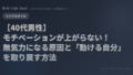 40代は、車のバッテリーが古くなってきている状態と同じです。スマホを見て寝転がっていても、暗電流のようにエネルギーは漏れ出し、全く充電されません。